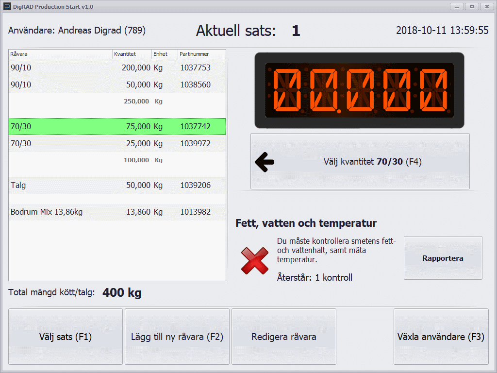 Utöver att tala om vilken råvara som förbrukas i produktionen behöver även smetens fett- och vattenhalt samt temperatur återrapporteras i applikationen. Beroende på uppmätt fetthalt så korrigeras innehållet i satsen genom att ytterligare talg och/eller kött tillsätts, detta för att smeten ska få den fetthalt som är optimal vilket också ger absolut högsta kvalitet på slutprodukten.